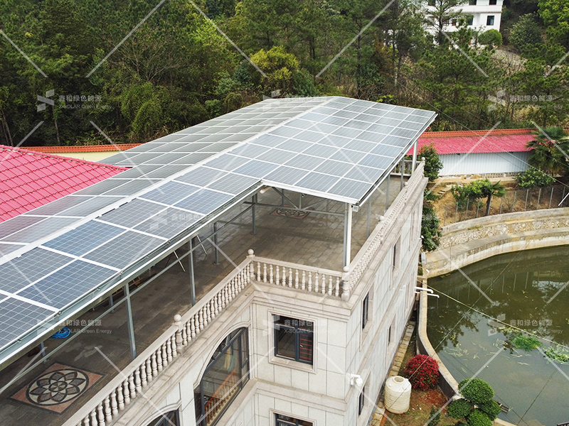 客户在湘乡棋梓镇有一栋别墅房,楼顶是一个200来平米的露天阳台,思量到炎天屋顶很热,顶层室内温度也很高,以是妄想在阳台装置一个阳光棚。通过经销商相识到可以用光伏瓦装个阳光棚,既可以防水、隔热,又可以发电。